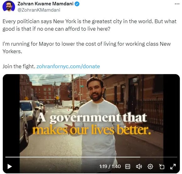 As regular readers know, I am not an NYC voter. So I had to resort to merely posting early and often about the Mayoral candidate Zohran Mamdani. What attracted me from his initial campaign launch was his message about how government can be a tool for improving the lives of ordinary people.